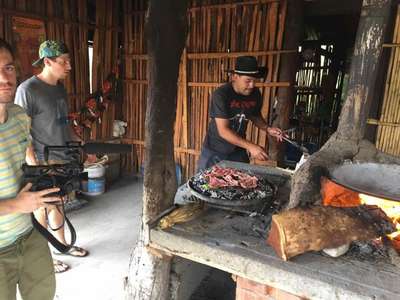 Day 27 – Monday morning was a time to reset and catch up on a tally of footage logging and other online tasks. By late afternoon we said our goodbyes to our hostel amigos and took off, down the coast a couple dozen miles, to the pristine beach town of Zipolite. Arriving just before dusk, the roar of our muffler alone felt disruptive to the overwhelming calm of this chilled-out, hippie paradise. Thanks to iOverlander, we targeted a campsite right on the beach. But when I say ‘right on the beach’, I literally mean RIGHT ON THE BEACH. We set up our Ticla tent beneath a cabana on the sand itself, towering over the neighboring tents, and without a word, stared into the crashing waves against the unobstructed oceanfront. The town’s tranquil vibe caught hold of our cumulative consciousness. For dinner, a local lady cooked us up somecamarones del Diablo (shrimp in spicy red sauce), which we painstakingly, yet hilariously, de-veined ourselves.