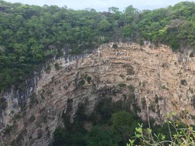 We pulled off the highway and onto a nicely paved side road with a sign pointing us to Sima de las Cotorras (Sinkhole of the Parrots), where we hoped to catch a sight of the supposed hundreds of green parrots that take off early each morning from within the depths of a giant crater. We followed signs to the next not-so-nicely paved road, followed by 4 more roads of worsening and more isolated conditions. Once we did find the sinkhole, it was far bigger than we could have realized. We did a midnight walk-through around the sima’s fringes to scout out the ideal camera position for the next morning, where Alex had a near death experience with a deadly vampire bat. On that note, we pitched our tent, ate a gourmet peanut butter and Thunderbird dinner, set our alarm for before daybreak, and drifted into dreamland.
