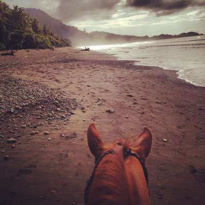 After starring into the horizon for a while and getting the boys to at least sniff this weird looking substance, we continued our ride for Jaco. I cant even express how big this moment is for us! I remember daydreaming about my Long Ride from Toronto 2 years ago and walking my ponies on the shores of the Pacific Ocean was such a distant thought. Now here we are, leaving hoof prints in the sand.